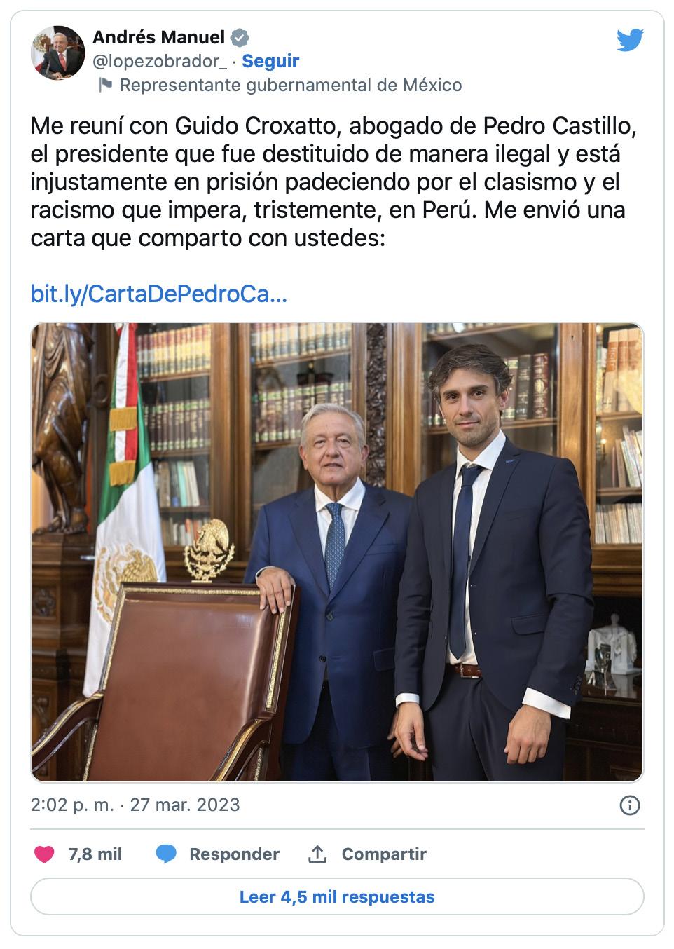 LÓPEZ OBRADOR SE REÚNE CON GUIDO CROXATTO, ABOGADO DE PEDRO CASTILLO