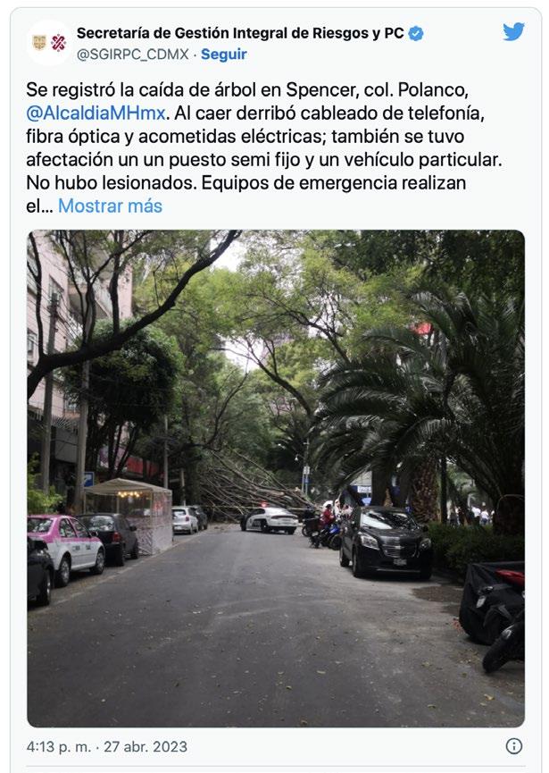 Durante la tarde de este jueves 27 de abril del 2023, la Secretaría de Gestión Integral de Riesgos y Protección Civil (SGIRPC) reportó la caída de un árbol en las calles de la Ciudad de México, hasta el momento no se reportan heridos. La SGIRPC informó que la caída del árbol
