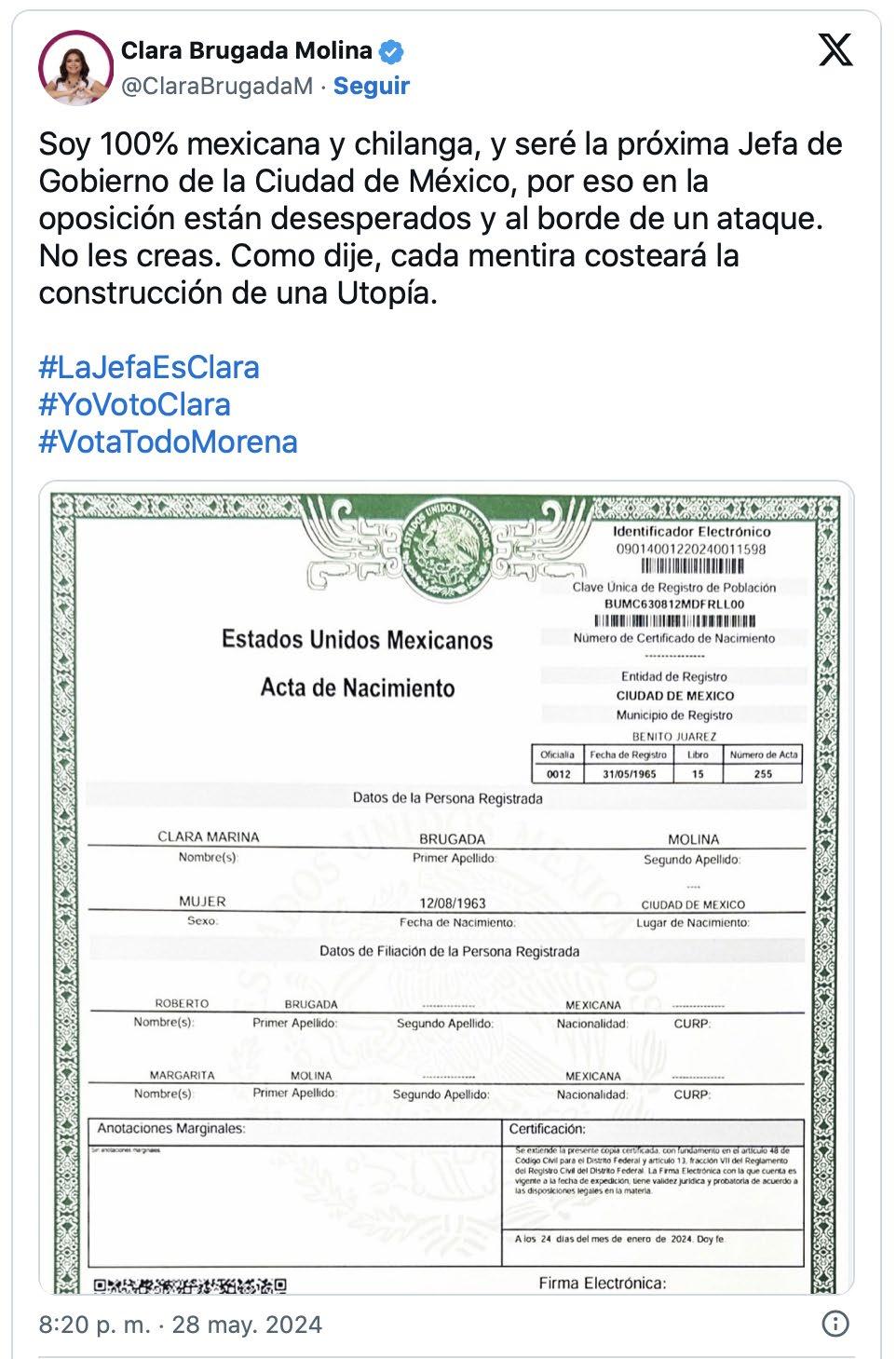 Por medio de redes sociales, la candidata Clara Brugada de la coalición “Sigamos Haciendo Historia” conformada por Morena, PT y PVEM subió una fotografía de su acta de nacimiento después de que en redes sociales circulara un supuesto documento en el que se señala que es de Guatemala.