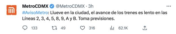 El Metro de la CDMX informó que el avance de trenes es lento, por lo que invita a tomar previsiones. Usuarios reportan al menos 15 minutos de espera en estaciones de la Línea 3. El Metro de la CDMX adelantó que, debido a las lluvias, el tránsito de trenes será lento en las líneas 2, 3, 4, 5, 8, 9, A y B. Se recomienda tomar previsiones.