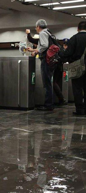 Los paraguas tuvieron que hacerse presentes en la zona de andenes y torniquetes, por lo que los usuarios se replegaron. Videos registran la cantidad de agua que se filtra en la estación y desciende hasta las vías.