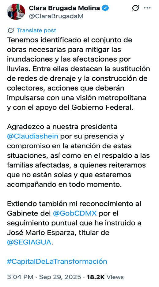detalló que las alcaldías más afectadas fueron Iztapalapa y Tláhuac, donde la lluvia se mantuvo de manera intensa por más de cuatro horas. “En 24 horas logramos desfogar el 90 por ciento de las inundaciones, tanto en Iztapalapa como en Tláhuac. Y hoy en la madrugada concluyó el 100 por ciento el abatimiento a las inundaciones que enfrentamos”, agregó. Asimismo, la gobernante local puntualizó que entre las zonas más afectadas está la zona de Ejército de Oriente, Desarrollo Urbano Quetzalcóatl, La Colmena, el Pueblo de Santa María Aztahuacán, la Unidad Habitacional Vicente Guerrero y Ejidos de Santa María Aztahuacán entre otras. Brugada adelantó que ya se planean intervenciones en las zonas de afectación permanente como el distribuidor vial de La Concordia, Los Reyes, y la calzada Ignacio Zaragoza, donde se trabaja en coordinacióncon el Estado de México y con la Comisión Nacional del Agua (Conagua), para empezar las obrascon el fin de que esa zona pueda tener un gran colector para canalizar el agua de lluvia. “Queremos darle un mensaje a las familias que resultaron afectadas, que vamos a apoyar a todas y a cada una, que no los vamos a dejar solos, que vamos a estar ahorita en la etapa que tiene que ver con el apoyo a la emergencia, con el apoyo a sus afectaciones y sobre todo trabajar en estas obras”, indicó la jefa de Gobierno. “Queremos darle un mensaje a las familias que resultaron afectadas, que vamos a apoyar a todas y a cada una, que no los vamos a dejar solos, que vamos a estar ahorita en la etapa que tiene que ver con el apoyo a la emergencia, con el apoyo a sus afectaciones y sobre todo trabajar en estas obras”, indicó la jefa de Gobierno.