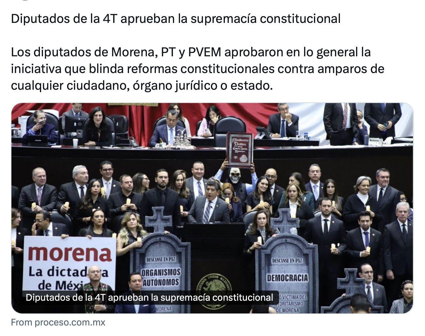 Con el voto mayoritario de Morena y sus aliados, la Cámara de Diputados aprobó, en lo general la supremacía constitucional que contempla el dictamen que modifica los artículos 105 y 107 de la Constitución para dejar establecido que ningún amparo ni ningún recurso legal procede contra una reforma a la Carta Magna.Con esta reforma en materia de “supremacía constitucional”, avalada por 340 votos a favor, una abstención y 133 en contra del PAN, PRI y MC, se busca “blindar” las reformas de la llamada cuarta transformación contra cualquier impugnación. En sus artículos transitorios se establece la aplicación retroactiva de la reforma, con el fin de evitar la eventual invalidación parcial de la reforma al Poder Judicial, como lo prevé el proyecto que la Suprema Corte discutirá el próximo martes. Al inicio de la discusión, los grupos parlamentarios del PAN, PRI y MC presentaron mociones suspensivas para frenar la discusión de la reforma y devolverla a comisiones para analizarla con mayor detenimiento, pero la mayoría de Morena y aliados las rechazaron.