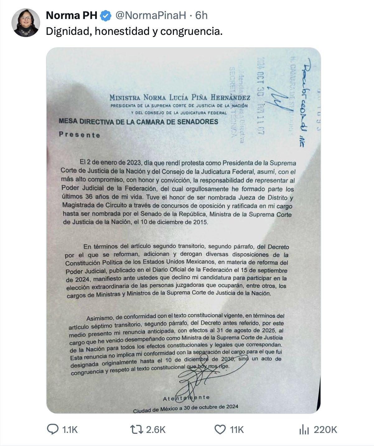 En la carta de Norma Piña, se lee lo siguiente: “De conformidad con el texto constitucional vigente, en términos del artículo séptimo transitorio, segundo párrafo, del Decreto antes referido, por este medio presento mi renuncia