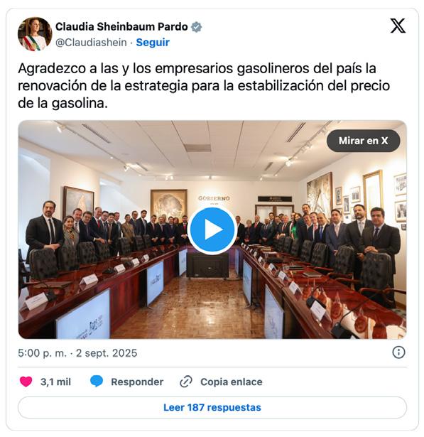 “Agradezco a las y los empresarios gasolineros del país la renovación de la estrategia para la estabilización del precio de la gasolina”, destacó en sus redes sociales.