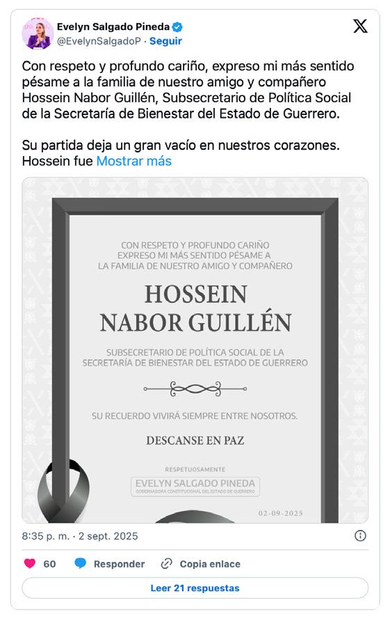 La gobernadora de Guerrero, Evelyn Salgado expresó sus condolencias en su cuenta de X: “Con respeto y profundo cariño, expreso mi más sentido pésame a la familia de nuestro amigo y compañero Hossein Nabor Guillén, Subsecretario de Política Social de la Secretaría de Bienestar del Estado de Guerrero.” Salgado calificó al Hossein Nabor como “un hombre comprometido con las causas del pueblo, generoso, solidario y siempre dispuesto a servir a los demás”.