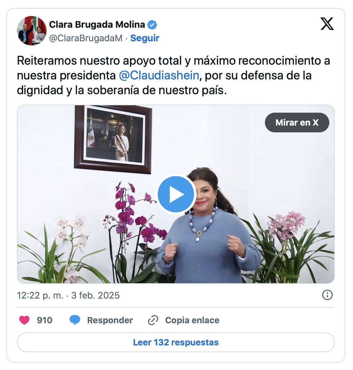 “Respaldamos su firme decisión y logros para proteger la economía de México y evitar medidas unilaterales que la afecten. Desde la Ciudad de México, seguiremos trabajando en defensa del bienestar y los intereses de nuestra nación”, concluyó Brugada Molina.