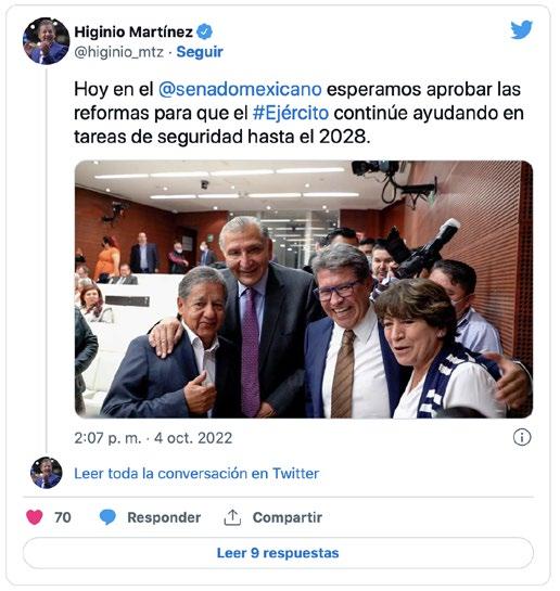 La Cámara de Diputados recibió la minuta de la ampliación de las tareas de las Fuerzas Armadas hasta el 2028 que aprobó el Senado este martes. Mediante su cuenta oficial de Twitter, el coordina dor de los diputados de Morena, Ignacio Mier, celebró la aprobación de la minuta. El líder de la bancada mayoritaria destacó que la Cámara de Diputados se encuentra lista para discutir y votar la reforma.m“ Celebramos la aprobación en el @senado mexicano de la reforma que extiende el plazo de las Fuerzas Armadas en labores de seguridad. Las y los @DiputadosMo rena estamos listos para analizar y dar trámite a la minuta. Lo importante es garantizar la seguridad de todas las fami lias”, expresó. Por separado, mediante su cuenta de Twitter, el presidente de la Cámara de Diputados, Santiago Creel, felicitó a los senadores de Acción Nacio nal y del Grupo Plural por su voto en contra. Adelantó que como diputado federal votará en contra de la reforma. “Quiero reconocer, felicitar y agradecer el voto unánime de las y los Senadores de @AccionNacional, y de las y los Senado res del PRI, MC, PRD y Grupo Plural que defendieron a México y buscaron frenar la militarización del país y la fallida estrategia de seguridad”, manifestó. El ex secretario de Gobernación advirtió que las Fuerzas Armadas incumplirán con los principios constitucionales que rigen su actuación en seguridad pública: extraor dinaria, subordinada, complementaria, regulada y fiscalizada.