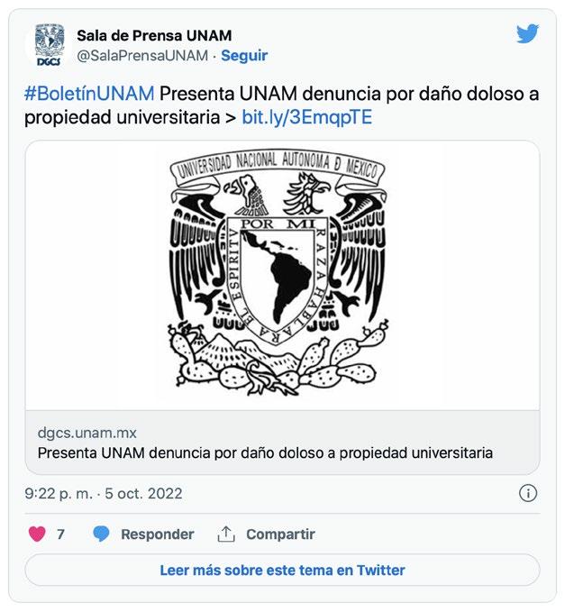 La Universidad Nacional Autó noma de México (UNAM) presentó una denuncia en contra de las per sonas que la tarde de este miércoles ocasionaron daños dolosos al patri monio en Ciudad Universitaria. Poco después de las 14:00 horas de este miércoles, unas 40 personas entre hombres y mujeres, procedentes del Colegio de Ciencias y Humanidades, plantel Sur, quienes portaban palos, hachas, martillos, entre otras herra mientas, ocasionaron diversos daños a instalaciones universitarias, en particular en la explanada y entrada principal de la Torre de Rectoría. Los agresores, encapuchados y vestidos de negro, detonaron varios artefactos explosivos en la explanada y, poste riormente, en la zona conocida como “Las Islas” vandalizaron muros, así como las letras modulares “+UNAM” (Positivamente UNAM), ubicadas frente a la biblioteca central.