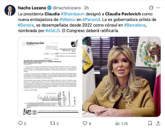 La presidenta Claudia Sheinbaum formalizó ante la Comisión Permanente del Congreso de la Unión su propuesta para designar la exgobernadora priista de Sonora Claudia Pavlovich como embajadora Extraordinaria y Plenipotenciaria de México en la República de Panamá. A través de un oficio firmado por la secretaria de Gobernación, Rosa Icela Rodríguez, se notificó al senador Gerardo Fernández Noroña, presidente de la Mesa Directiva, sobre la decisión presidencial, conforme a lo dispuesto por la fracción