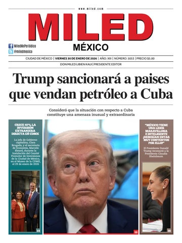 MILED MÉXICO edición matutina diaria. Se edita en su propia planta de Impresiones MLS S.A. de C.V. en Lázaro Manuel Muñoz No. 106 Col. Altamirano. Toluca de Lerdo, Méx. C.P. 50130. Teléfonos: 722 2179880 y 722 2179646. Fundado el 31 de Marzo de 2012. Se distribuye en la Ciudad de México e Interior del País. Certificado de Reserva de Derechos al uso Exclusivo del Título (Indautor) No. 101 110S16475100-2013-04. Certificado de Licitud de Título y Contenido No.16214. Servicios informativos de las agencias Notimex, SUN, EFE, United Feature Syndicate, Inc. NY, United, AP. Oficinas y Salas de Redacción en Nayarit No. 88 Col. Roma, Alcaldía Cuauhtémoc, Ciudad de México. C.P. 06760. Tel. 55644070. Precio del Ejemplar $5 pesos. Números atrasados el doble. Asociado a AIPE (Asociación Internacional de Prensa). Distribuido por la Unión de Expendedores y Voceadores de los Periódicos de México, A.C. Los firmantes son responsables de sus artículos. Se prohibe la reproducción total o parcial del contenido de esta edición. Dirección en Internet www.miled.com