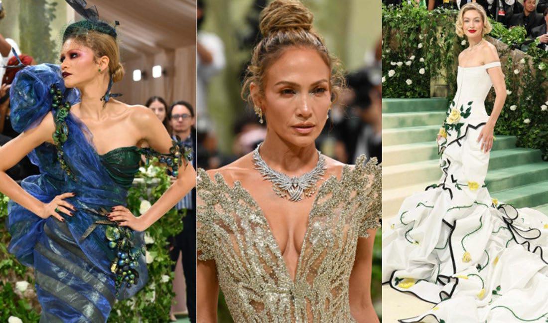 Esta tarde Nueva York se convirtió en el escenario de un jardín encantado en el que las flores y las celebridades fueron los protagonistas. Las afueras del Museo Metropolitano de Arte Contemporáneo se llenó de glamour y de los vestuarios más impresionantes con la alfombra roja de la Met Gala, y es que las figuras más grandes del mundo del cine, la música, la moda y el espectáculo en general se reunieron para este espectacular evento. Flores, colas enormes, extravagentes vestidos, capas, plumas, mariposas y colores pasteles se apoderaron del lugar dando paso al “Jardín del tiempo”, temática de la edición de este año. Una de la primeras en llegar fue la actriz de Euphoria, Zendaya, quien apareció en un bellísimo vestido en colores azul y verde, ceñido al cuerpo que adornó con diferentes mariposas, aves, hojas y pequeños frutos; además de un sombrero de tul, y de inmediato se convirtió en una de las mejores vestidas. Jennifer López, quien será una de las anfitrionas de la noche, se robó las miradas de los asistentes, pues se lució