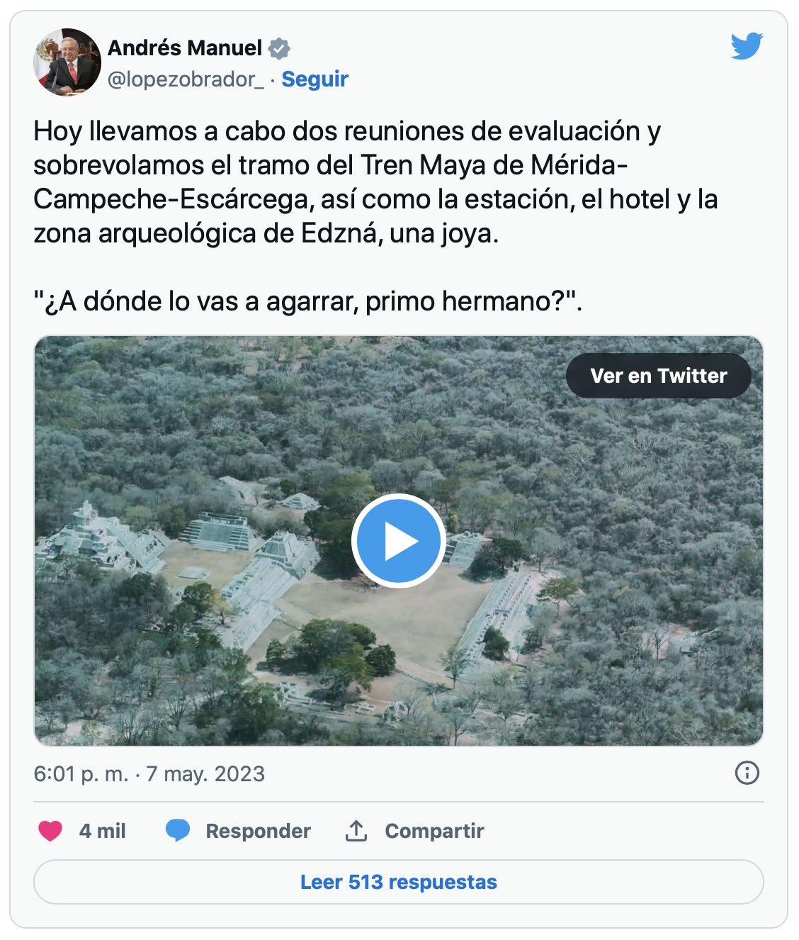 En su gira de regreso para supervisar los avances del Tren Maya tras haberlas suspendido el pasado 23 de abril al dar positivo a Covid, el presidente Andrés Manuel López Obrador encabezó este domingo dos reuniones de evaluación del proyecto ferroviario y sobrevoló el tramo Mérida-Campeche-Escárcega, así como la estación, el hotel y la zona arqueológica de Edzná. En su cuenta de Twitter el jefe del Ejecutivo federal difundió un video del sobrevuelo a bordo de un helicóptero de la Fuerza Aérea Mexicana (FAM) de la zona arqueológica de Edzná, la cual calificó como una”joya”, y expresó “¿A dónde lo vas a agarrar, primo hermano?”. “Hoy llevamos a cabo dos reuniones de evaluación y sobrevolamos el tramo del Tren Maya de Mérida-Campeche-Escárcega, así como la estación, el hotel y la zona arqueológica de Edzná, una joya. “¿A dónde lo vas a agarrar, primo hermano?”, escribió en la red social.