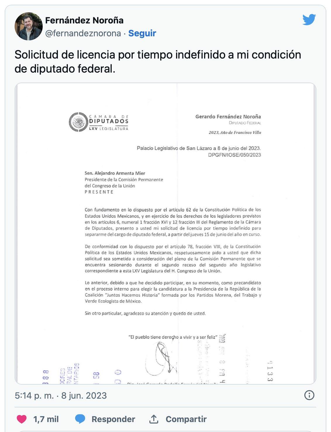 El legislador, quien ha comenzado a figurar en tercer lugar en algunas encuestas, por debajo de Claudia Sheinbaum y Marcelo Ebrard, ha afirmado que es el perfil de más izquierda de entre todos los aspirantes presidenciales que buscan continuar la llamada Cuarta Transformación. La mañana de hoy, Fernández Noroña desayunó con Mario Delgado, presidente de Morena, quien lo invitó en calidad de invitado especial a la sesión extraordinaria del Consejo Nacional del partido del próximo domingo, en la cual se elaborará la convocatoria para el proceso de selección del candidato presidencial para 2024. Con el diputado petista, suman cuatro “corcholatas” que anuncian que se separarán de sus respectivos públicos: el canciller Marcelo Ebrard dejará su cargo el lunes 12 de junio, el senador Ricardo Monreal anunció que lo hará la próxima semana y Manuel Velasco hoy presentó su solicitud de licencia para dejar su escaño. M
