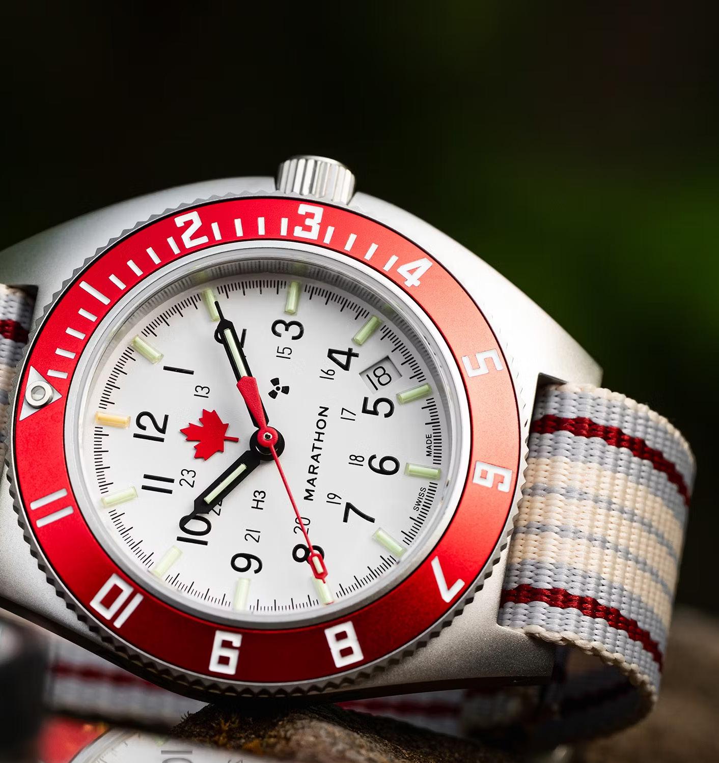 Antes de entrar en detalles, un poco de historia entre fronteras. El primer Marathon Navigator fue un reloj de cuarzo electrónico diseñado para pilotos, lanzado en 1986 en colaboración con la Base Aérea Kelly en Texas. Esta nueva versión es menos San Antonio y más Saint John. La carátula blanca ártica está dominada por una hoja de arce roja —idéntica a la de la bandera nacional, la cual fue presentada oficialmente hace exactamente 60 años— ubicada en el centro y la parte superior del dial.