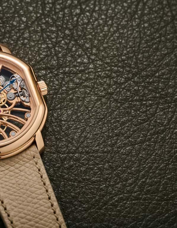 Los puentes y la platina del movimiento están fabricados en oro rosa de 18 quilates, lo que crea una continuidad visual con la caja del reloj. Para generar contraste, los engranajes, los tornillos y otros componentes mecánicos se mantienen en tonos metálicos más fríos. El resultado es un movimiento de tres tonos que ofrece profundidad visual y resalta la complejidad de su construcción.