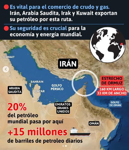 El estrecho de Ormuz, situado entre Irán y Omán, es el "cuello de botella" energético más importante del mundo, crucial para la economía global. Por él transita cerca del 20% del petróleo mundial diario y un 30% del gas natural licuado, principalmente de Arabia Saudita, Irán, Irak y Kuwait hacia Asia, convirtiéndolo en un punto crítico de alto riesgo geopolítico.
