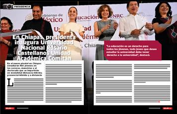 La presidenta Claudia Sheinbaum Pardo inauguró la Universidad Nacional Rosario Castellanos (UNRC) Unidad Académica Comitán en Chiapas, el primer plantel de esta institución fuera de la Ciudad de México. Este nuevo centro educativo ofrecerá carreras, maestrías y un doctorado en modalidades distancia-híbrida, presencial-híbrida y a distancia, beneficiando a 960 jóvenes. Sheinbaum destacó que uno de los objetivos de su administración es llevar la educación superior a todos los rincones del país, garantizando este derecho a los jóvenes. Durante su discurso, recordó que en los próximos seis años se buscará construir más universidades en todo el país, creando más de 330 mil nuevos espacios en educación superior.
