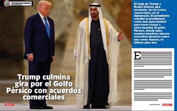 "Trabajamos juntos y el dinero que se gana aquí vuelve a nosotros", dijo Trump al príncipe heredero de Abu Dhabi, el jeque Khaled bin Mohamed bin Zayed, durante una conferencia de prensa en Abu Dhabi, promocionando la relación comercial entre Estados Unidos y los Emiratos Árabes Unidos.