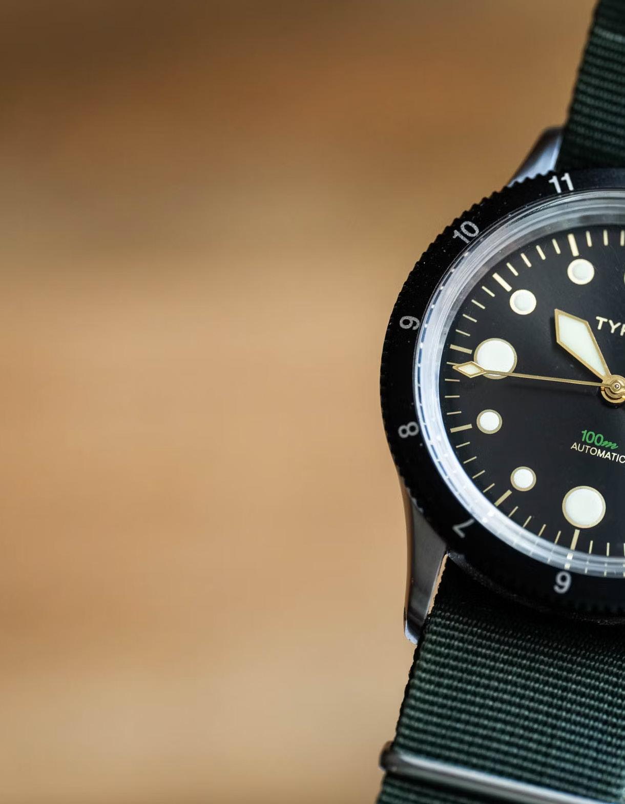 El aspecto vintage en un reloj moderno suele lograrse imitando una esfera dorada (gilt dial), una pátina envejecida del lumen, o ambas cosas. Typsim logra ambas de forma auténtica. El 100M, como muchos de los otros modelos de la marca, tiene una verdadera esfera gilt y luminiscencia Super-LumiNova diseñada para envejecer.