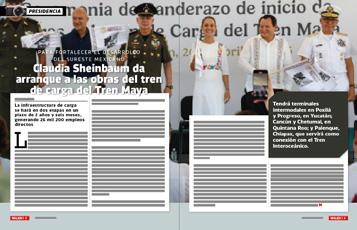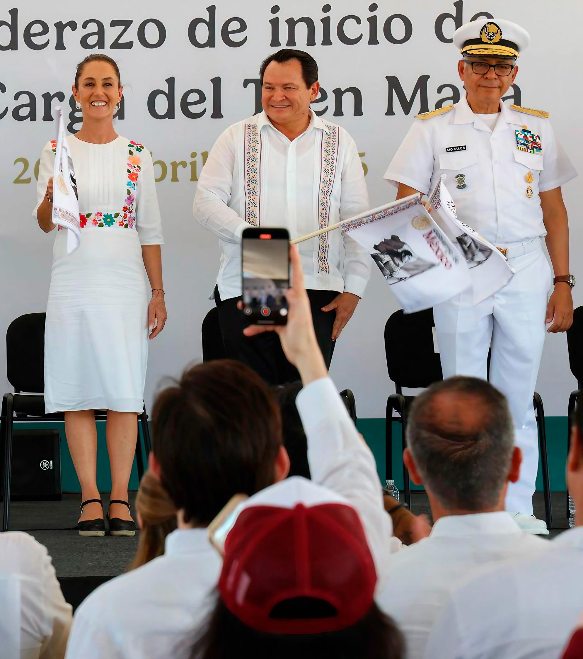 La Presidenta de México, Claudia Sheinbaum Pardo, dio arranque a las obras para la construcción de la infraestructura de carga del Tren Maya con lo que este sistema ferroviario transportará pasajeros y mercancías con el objetivo de fortalecer el desarrollo del sureste mexicano. “Ahora estamos dando el banderazo de salida para que el Tren Maya no solo sea un tren de pasajeros, sino un tren de carga. ¿Qué importancia tiene esto? Bueno, la carga transporta mercancías de distinto tipo y el tren de pasajeros transporta personas. Entonces, al ser también un tren de carga, va a permitir que todo el sureste de México tenga todavía más desarrollo del que se ha logrado con el Tren Maya, que es principalmente un desarrollo turístico. “El tren de carga le va a dar un potencial enorme para que lo que se produzca en otros lugares del país, o aquí en el sureste, pueda tener una transportación de la manera más eficiente posible”, puntualizó. Detalló que el Agrupamiento de Ingenieros Felipe Ángeles de la Secretaría de la Defensa Nacional será el encargado de construir la infraestructura de carga del Tren Maya, obra que se vinculará al desarrollo de Puerto Progreso, cuyos trabajos de ampliación están a cargo de la Secretaría de Mari-