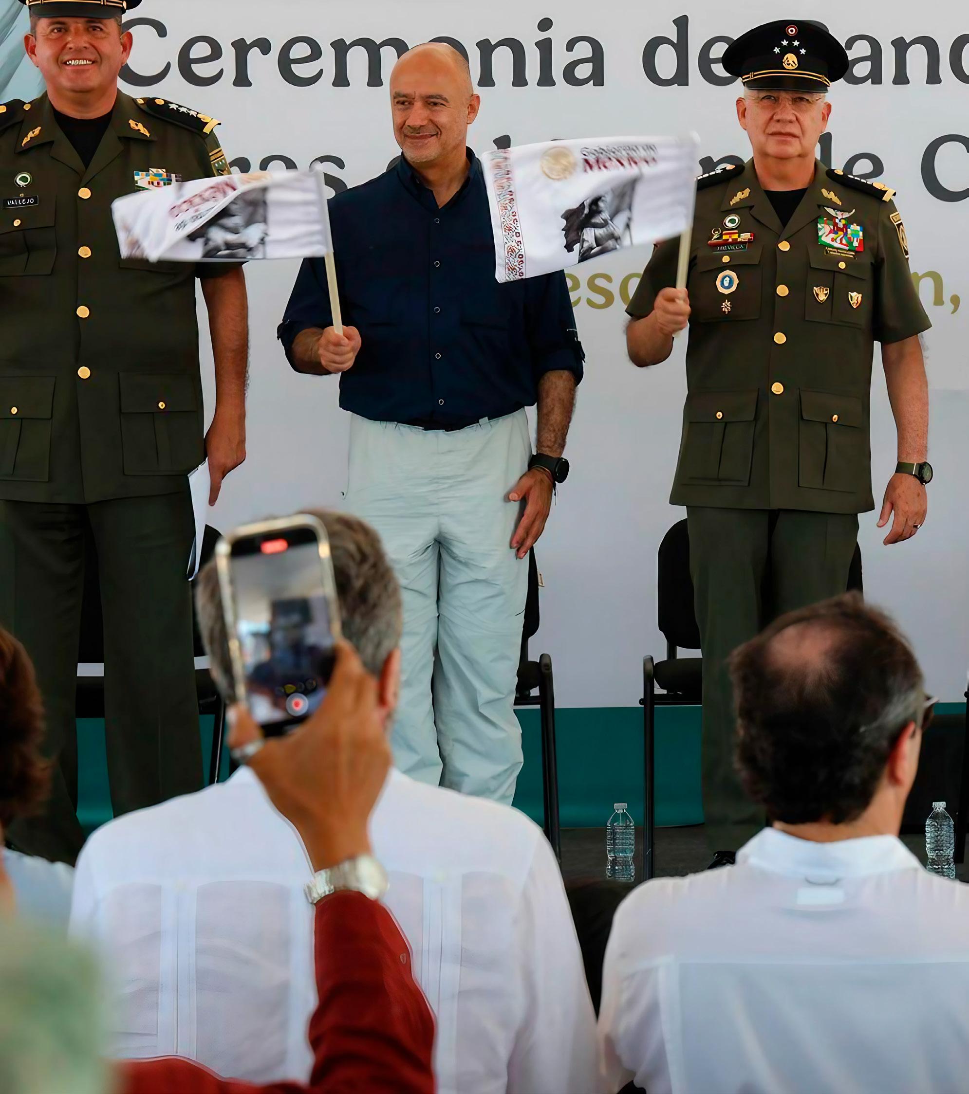 Así como el director general del Instituto Nacional de Antropología e Historia (INAH), Diego Prieto Hernández; el supervisor honorario del Tren Maya, Daniel Chávez Morán; el director general del Tren Maya, Óscar David Lozano Águila; el comandante interino de la Décima Región Militar, Cristóbal Lozano Mosqueda; el secretario técnico de la Presidencia de la República y coordinador general de Programas para el Bienestar, Carlos Torres Rosas; la coordinadora de Asuntos Intergubernamentales y Participación Social de la Presidencia de la República, Leticia Ramírez Amaya; y el coordinador territorial de la Región Sureste, general Juan Carlos Guzmán Giadans. M