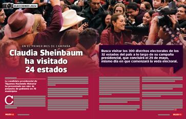 Claudia Sheinbaum Pardo, candidata presidencial de la coalición Sigamos Haciendo Historia (Morena-PT-PVEM), visitó 24 estados durante su primer mes de campaña rumbo a las elecciones del próximo 2 de junio, en los cuales se ha reunido con más de 1 millón 200 personas y ha presentado al menos siete ejes de su proyecto de nación.
