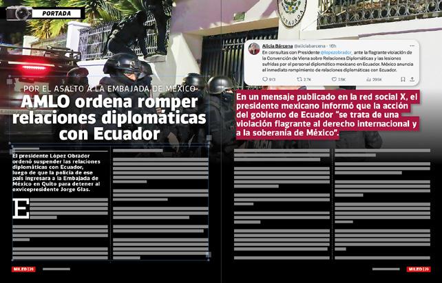 Después la irrupción de autoridades de Ecuador a la Embajada de México en ese país para detener a Jorge Glas, la canciller Alicia Bárcena indicó que, “ante la flagrante violación de la Convención de Viena sobre Relaciones Diplomáticas y las lesiones sufridas por el personal diplomático mexicano en Ecuador”, México anuncia el inmediato rompimiento de relaciones diplomáticas con dicho país.