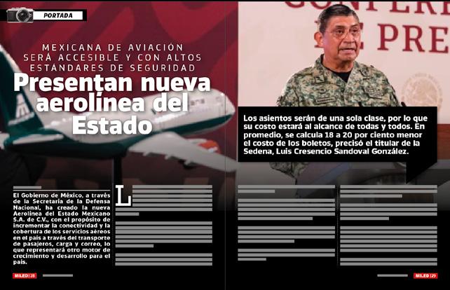 El Gobierno de México, a través de la Secretaría de la Defensa Nacional, ha creado la nueva Aerolínea del Estado Mexicano S.A. de C.V., con el propósito de incrementar la conectividad y la cobertura de los servicios aéreos en el país a través del transporte de pasajeros, carga y correo, lo que representará otro motor de crecimiento y desarrollo para el país.