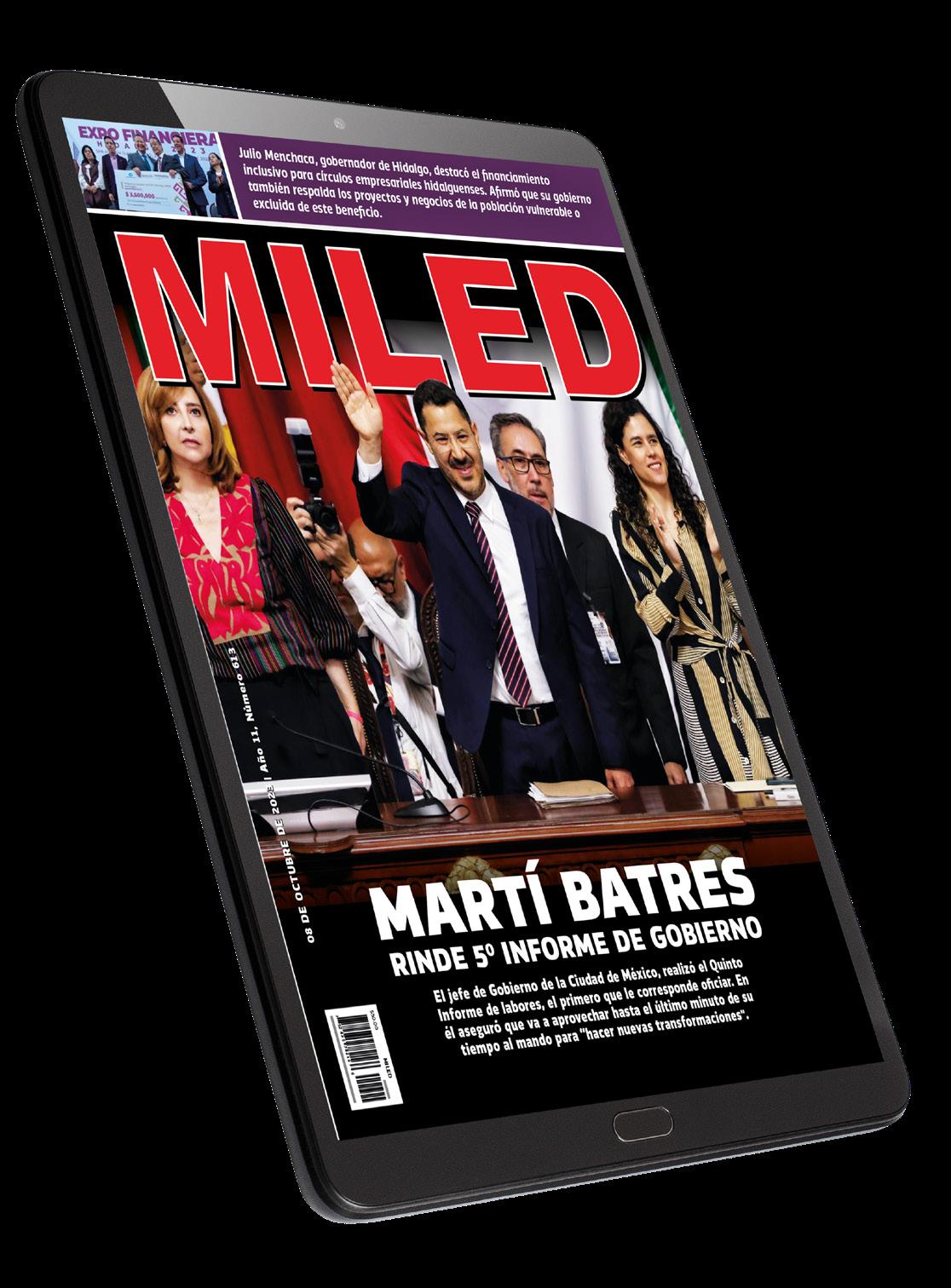Revista MILED edición semanal. Fundada el 15 de Enero de 2012. Fecha de impresión: Octubre 2023. Se edita en su propia planta de Impresiones MLS S.A. de C.V. en Lázaro Manuel Muñoz No. 106 Col. Altamirano. Toluca de Lerdo, Méx. C.P. 50130. Teléfonos: 722 2179880 y 722 2179646. Se distribuye en la Ciudad de México e Interior del País. Certificado de Reserva de Derechos al uso Exclusivo del Título (Indautor) No. 04-2018-052817583300-102. Certificado de Licitud de Título y Contenido No. 15692. Servicios informativos de las agencias Notimex, SUN, EFE, United Feature Syndicate, Inc. NY, United, AP. Oficinas y Salas de Redacción en Nayarit No. 88 Col. Roma, Alcaldía Cuauhtémoc, Ciudad de México. C.P. 06760. Tel. 55644070. Precio del Ejemplar $30 pesos. Revista MILED investiga sobre la seriedad de sus anunciantes, pero no se responsabiliza de las ofertas relacionadas con los mismos. Los firmantes son responsables de sus artículos. Se prohibe la reproducción total o parcial del contenido de esta edición. Dirección en Internet www.miled.com