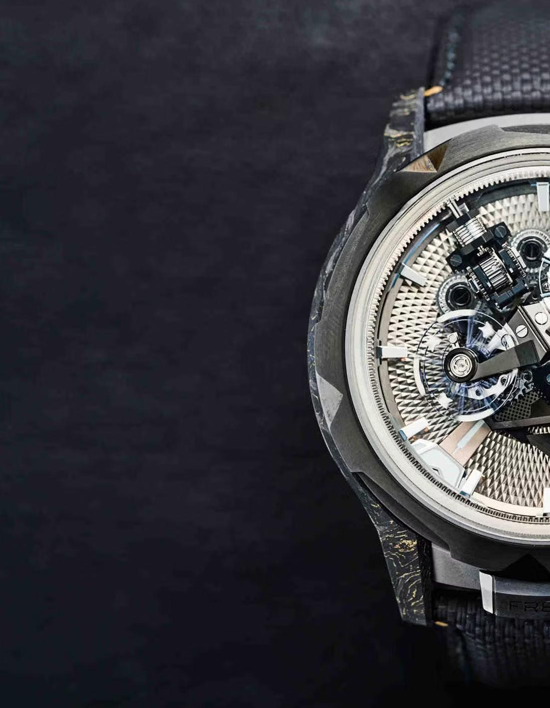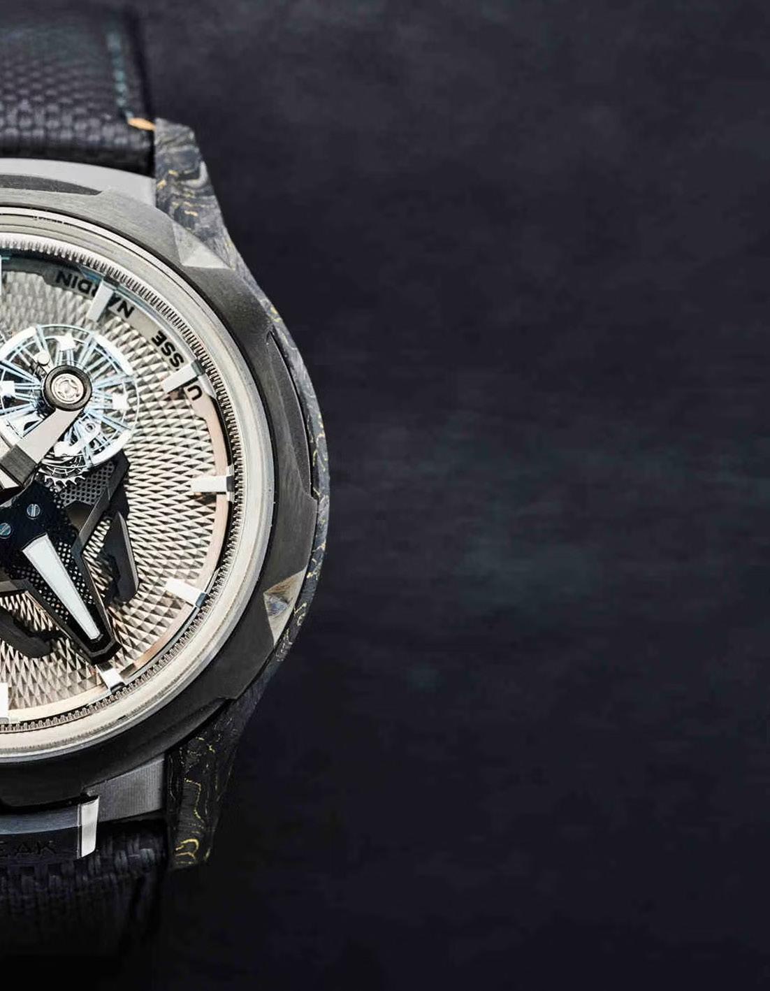 Para evitar que el reloj se vuelva demasiado tradicional, la marca se ha mantenido fiel a los componentes de silicio, como ha sido estándar para UN. Los volantes de silicio están inclinados a 20 grados y los escapes tratados con DIAMonSIL de alta tecnología (diamante monocristalino sobre silicio) para mayor precisión y durabilidad. La caja, como se puede ver en las fotos, parece tener motas de oro, pero en realidad, son solo las aletas de fibra de carbono que también sirven como las asas del reloj. El resto de la caja, así como el cierre abatible a las 6 en punto, está en titanio recubierto de PVD antracita. Ese cierre puede levantarse con un dedo y todo el bisel gira para ajustar la hora.