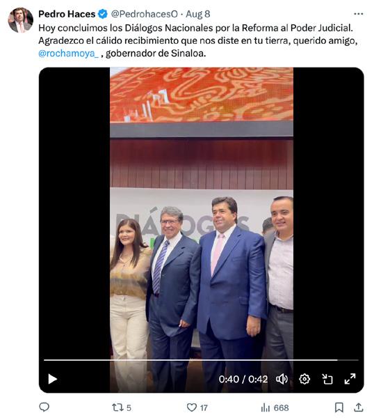 fianza al gobernador Rubén Rocha Moya, de Sinaloa. Lo felicito porque da la cara, no dejó pasar ni un día porque no hay casualidad; ayer nosotros en la mañana estábamos pidiendo información, al mediodía el embajador de Estados Unidos informó sobre la versión que ellos tienen de estos sucesos aquí en Sinaloa y hoy aparece esta carta y resulta que estamos aquí, en Culiacán, pues de una vez vamos a hablar sobre el tema y qué bien que se aclaró. (…) México es un país independiente, libre, soberano. Aquí mandamos los mexicanos”, indicó.