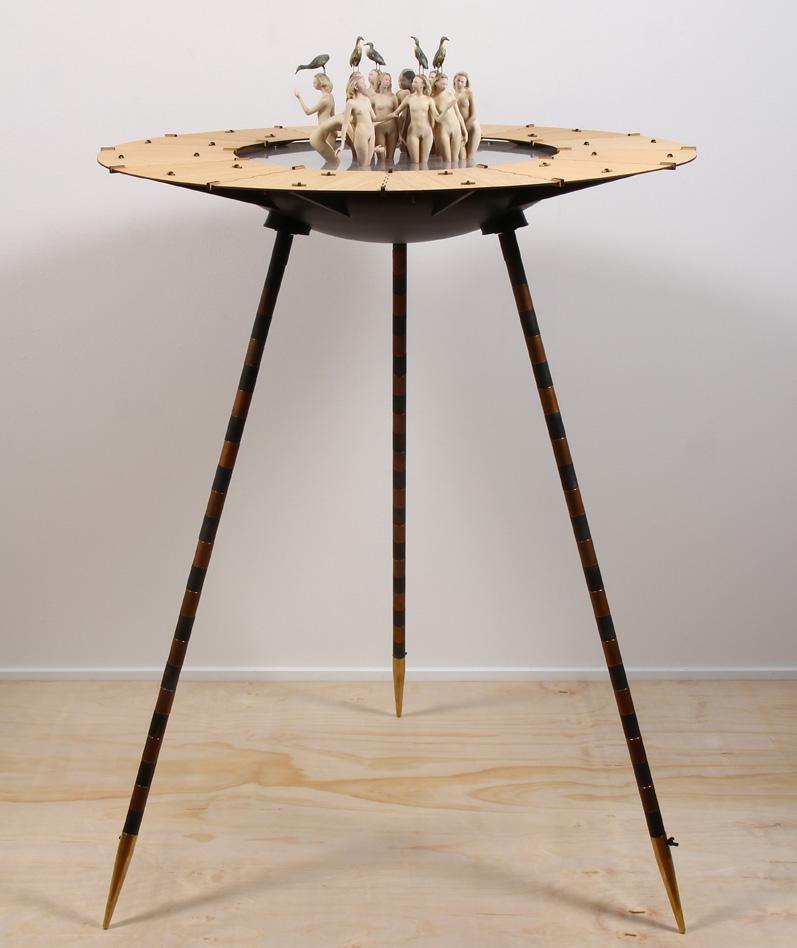 Bosch’s pond is reimagined in steel, bamboo, copper, and brass. The human (and matuku) figures are tightly bound by the pond’s circumference but there is a sense of collective stasis in the vague, desultory gestures. Perched on high, the figures occupy the centre of the work but are dwarfed in scale by the structure of the sculpture itself. We need to ask if Bennett wants us to consider the outsize impact of anthropogenic decisions on a world in which we are but one element.