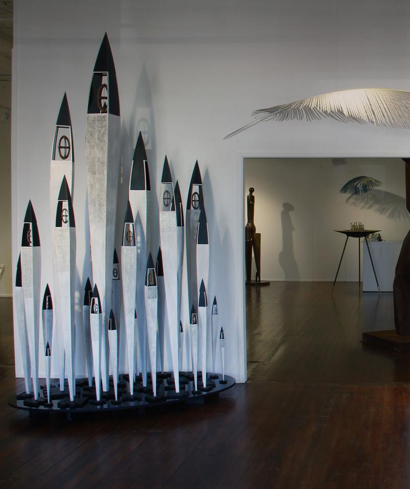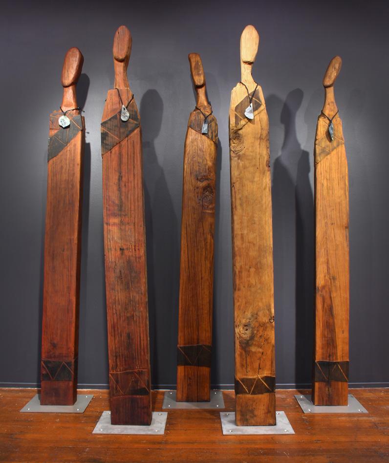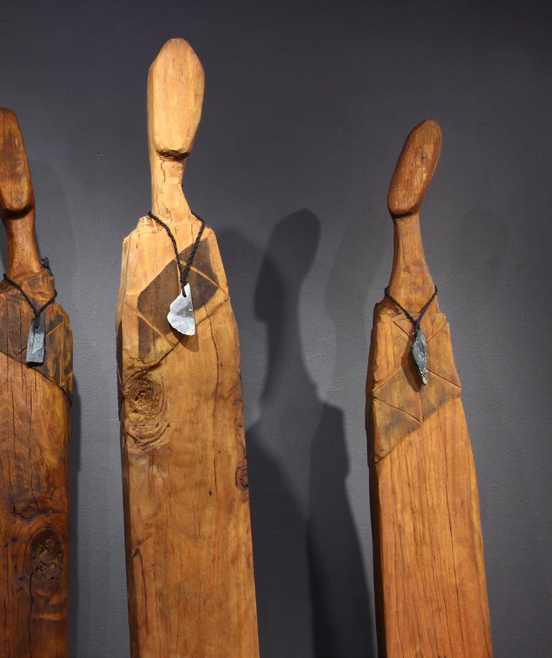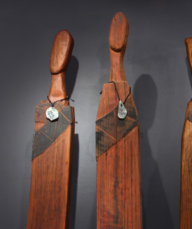 Anton Forde’s pou are time-travelling sentinels. All seeing, all knowing, individually and collectively they stand as guardians and protectors. Each pou is also as obviously listening. They are replete with individual characteristics and inclined heads, carved patterns and adornments. The accretive resonance and power of these exists in their silence, for ‘it is impossible not to imagine expressions,’1 or thought, and to talk back to the wisdom and warning they so clearly contain.