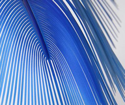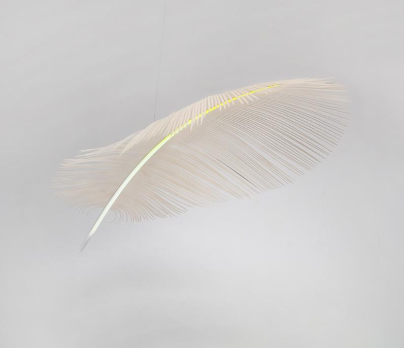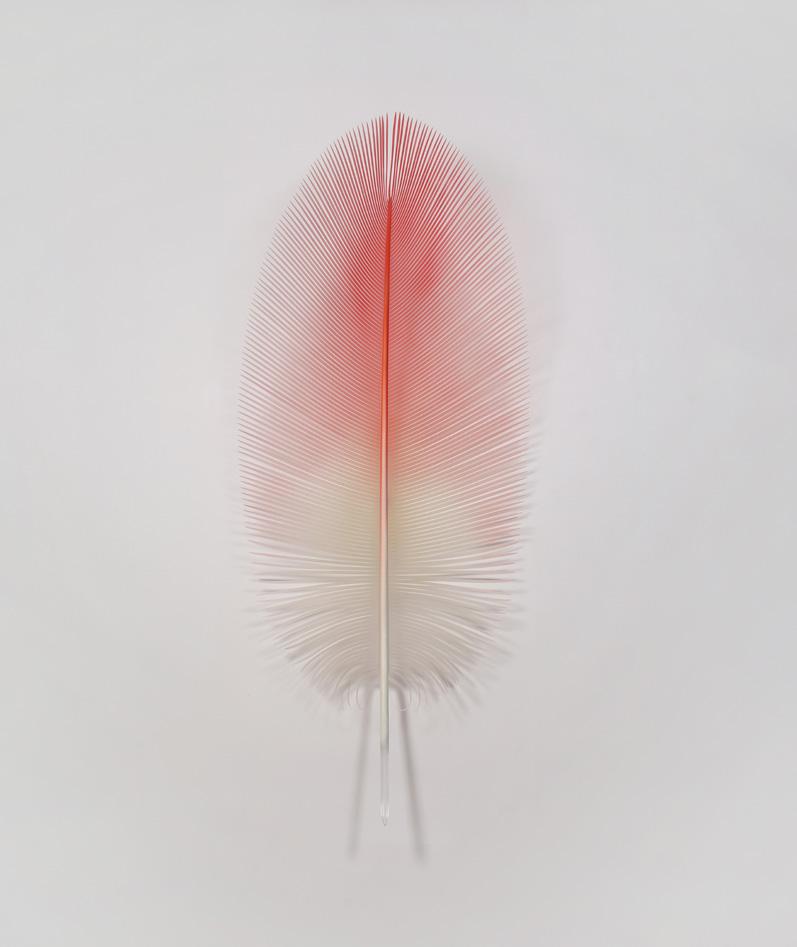 Playful and masterful, defying gravity yet as light as a feather, Neil Dawson’s spectacular use of colour, light, shade and shadow is quite simply unparalleled. Using parallax, the articulations of shadow and the lightest, deftest touch, Dawson has us see anew. He elevates the wall-mounted feather into a sculpted poem about the natural world. In the suspended feathers, quite different enveloping, protective sensations and patterns emerge. Light shimmers and most remarkably, as each slowly rotates in the shadows, down-beat wings emerge as the bird flies again.