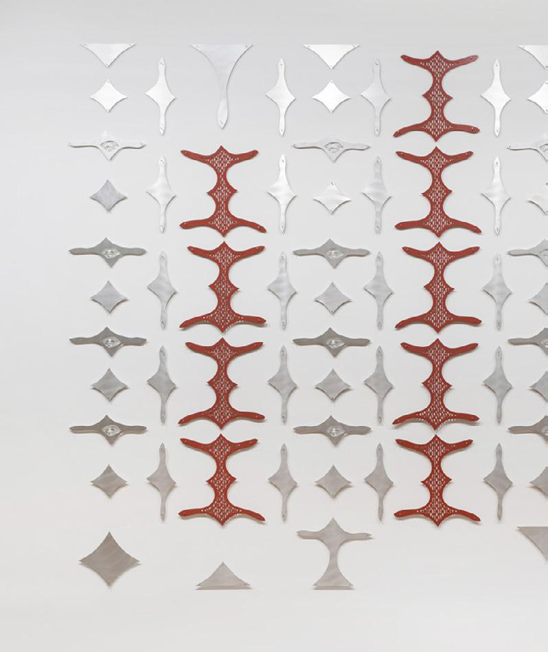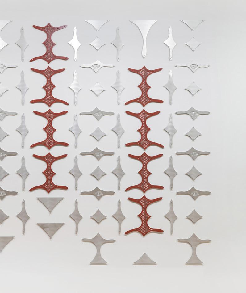 118 piece installation; brushed, powdercoated aluminium installation size on wall: 3260 x 5000 mm