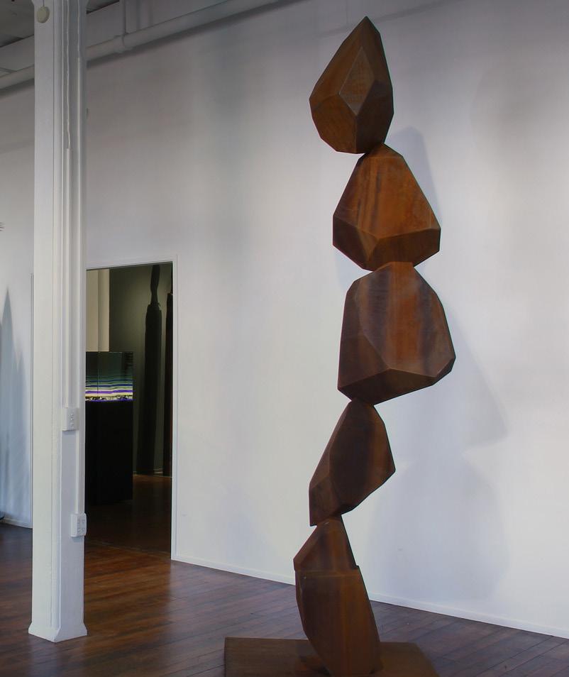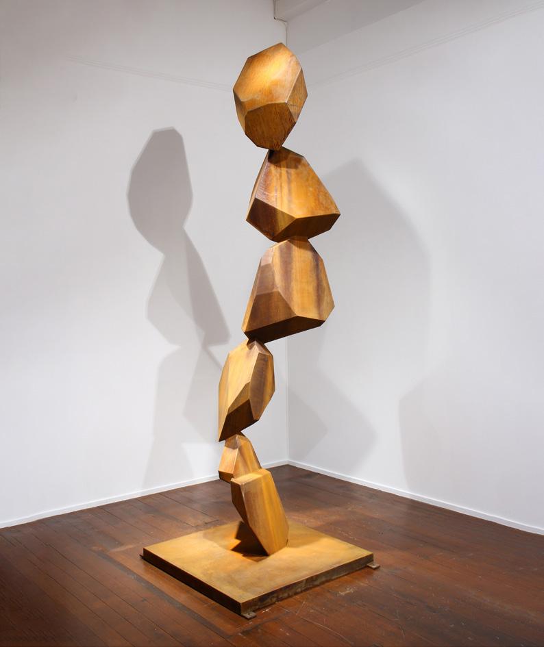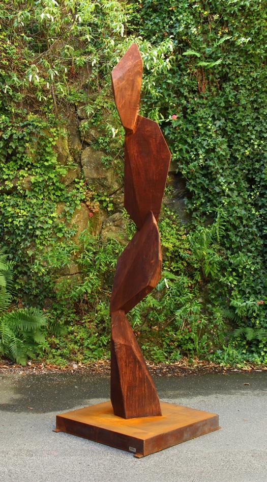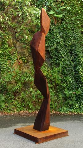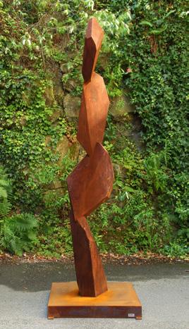 Paradox sits at the heart of Ben Pearce’s corten steel sculptures: they are strong, angular, seem comprised of abstracted rock-like forms and are at first reading brutalist. At the same time, they are soft and beautiful as well as totemic in character functioning as guardians and protectors of the environments they exist in. Arching in a helix spiral upward, the works exude a state of calm and being.