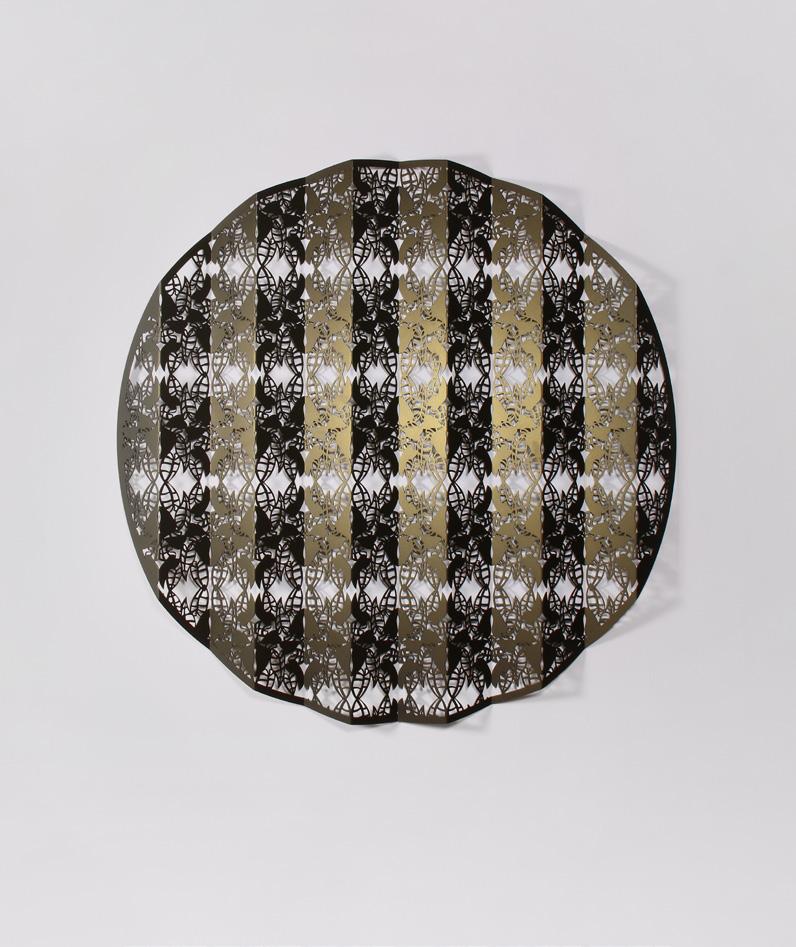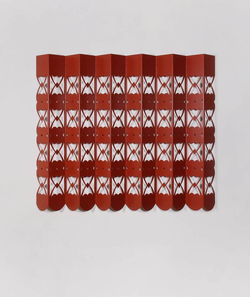 Hutchinson’s cut-out and multi-cultural folded works have quite rightly been accorded signature status. Incorporating repeated patterns which explicitly reference kōwhaiwhai and the leaves of native plants, the folded forms utilise the ever-changing mutability of light on the surface; and in the fluxing shadows behind another conversation emerges about non-materiality, and the inter-connected spaces between all things, people and places.