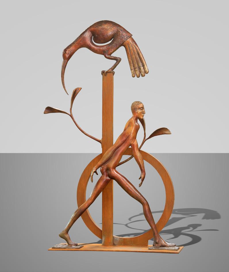 Using the metaphors of an abstracted tree upon which the huia perches with the circle of life underneath, Dibble delivers the symbolism and ultimate paradox of the tall, striding figure heading in a different direction.