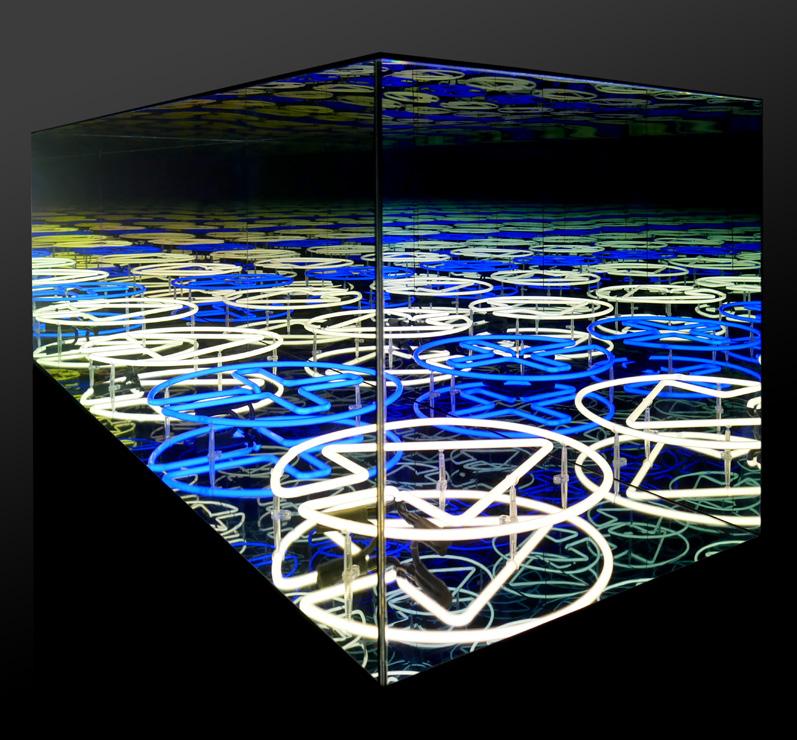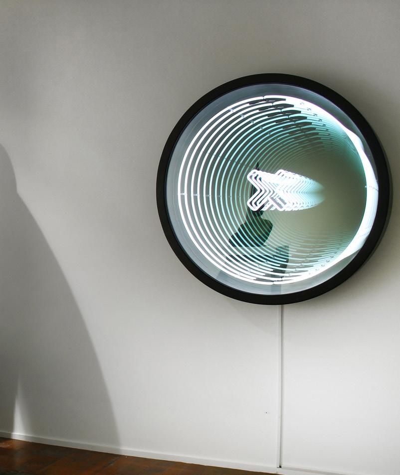metal, wood, paint, neon, one way glass, mirror, electricity size on wall: 1200 x 1200 x 211 mm