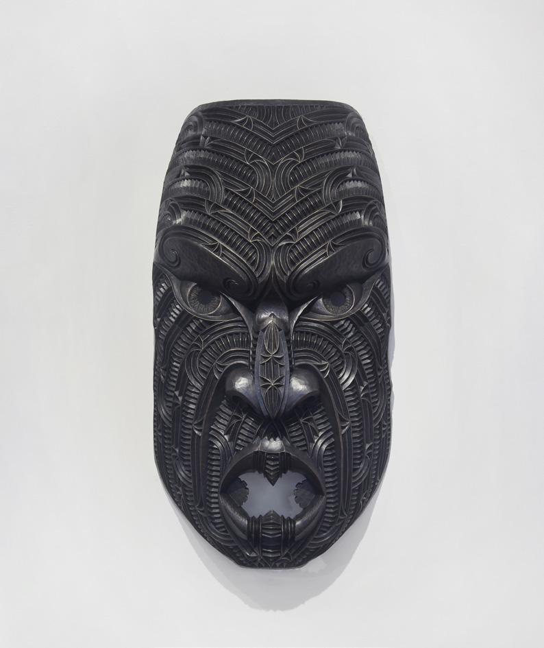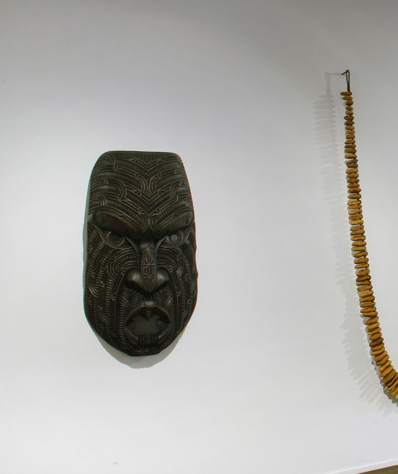 Also a very accomplished stone sculptor, Anton Forde’s acute sympathy for that material is amply represented in his very particular use of rare black pounamu. Delivered with remarkable restraint and tenderness, Forde builds an engaging visual metaphor of a teardrop form while into the surface of pounamu he has carved the Southern Cross. A roimata is a teardrop often linked with rain. The black of the stone reminds us at night the Southern Cross formation is seen. It was of pivotal importance for navigation and where the anchor for the celestial canoe was located.