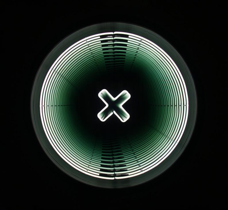 Jahnke ‘delves into Māori creation narratives and prophetic imagery … explores the narrative of Te Kore … conveys ideas in relation to Te Po and Te Ao Mārama … reflect on whakapapa as the ultimate system of order, while echoing the Māori philosophical concept of continuous time and infinite possibilities.’1 Jahnke emphasises the expansive and endless nature of time and space. He uses the infinity of reflection, the contrasts of light and dark as he presents an open-ended conversation on Māori notions of existence and time, sculpted in neon and glass.