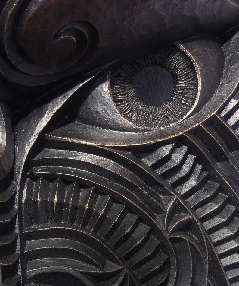 By day this deeply relief-sculpted work represents Tāwhirimātea, the Māori male god of weather and the personification of the weather in traditional Māori narratives, and by night the female god of weather, and Tawhiri’s wife, Hine-mai-oho-rangi.