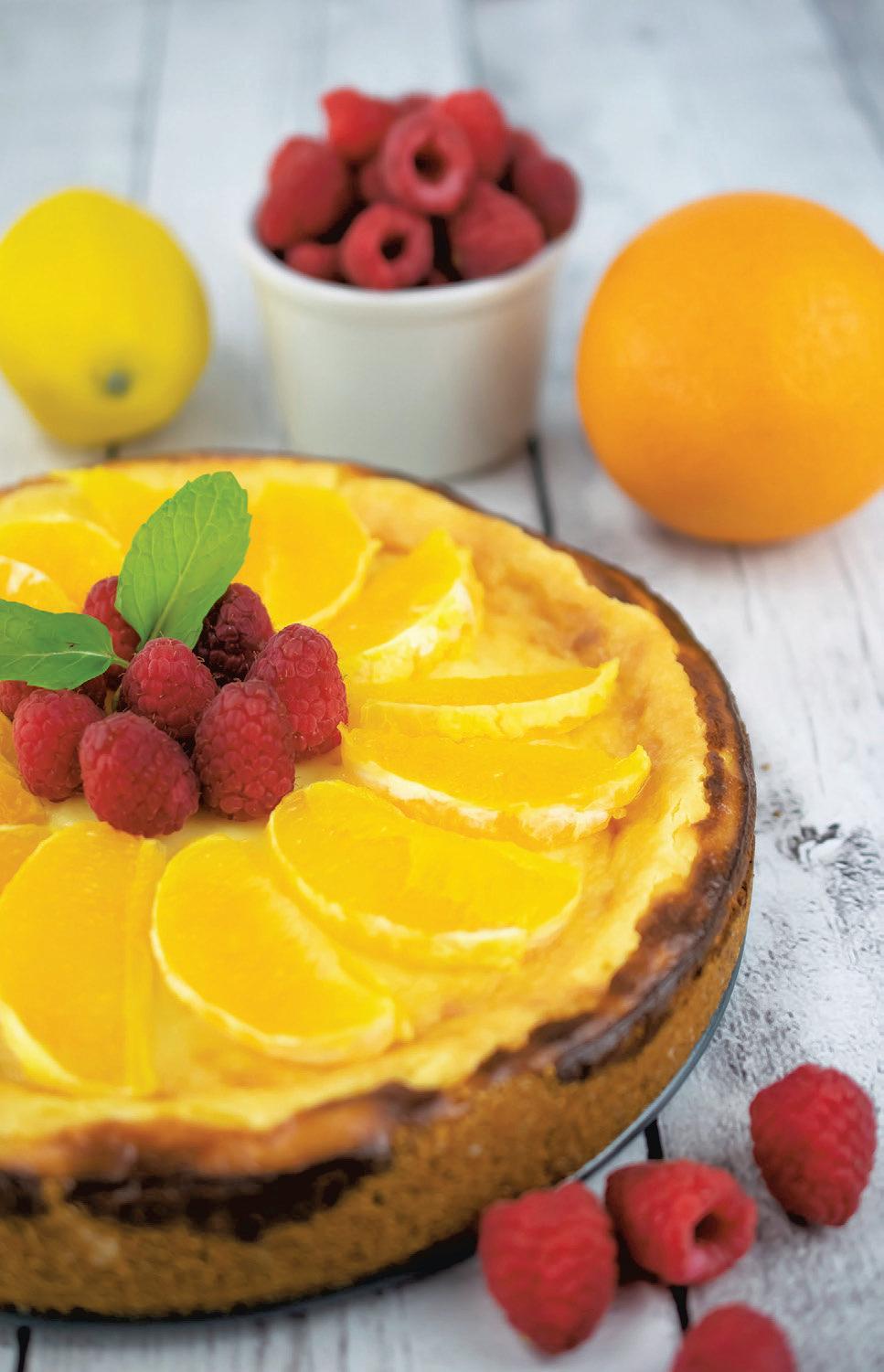 Thetouchoftangytartnessisenoughtobringlovedones to the dessert table even after a filling meal as fresh lemon juice in the cheesecake base is complemented perfectly whentoppedwithorangeslicesandraspberries Garnished withmintleaves,thisbrightlycoloredtreatisevensweeter whensharedwithlovedones FindmoresweetsummerdessertsatCulinarynet.