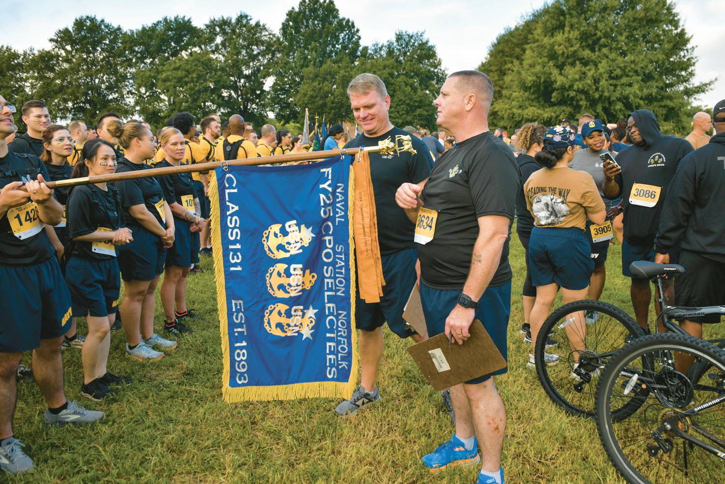 “I think this event is a great way to bring us together, remembering heritage and motivate each other during the rest of the [Chief]Season,”saidIntelligenceSpecialist ChiefPettyOfficerSelectAndrewHall,from Commander, Naval Surface Group (CNSG) Middle Atlantic. “It falls halfway through thesixweeksandwegettoseeeveryoneout here cheering us on to keep moving until the end. We got a lot of support from the communityandeventheretireesouthere. Participants started arriving at dawn, with chiefs and chief selectees assembling withtheirrespectivecommandstoformup and take part in warmup activities During
