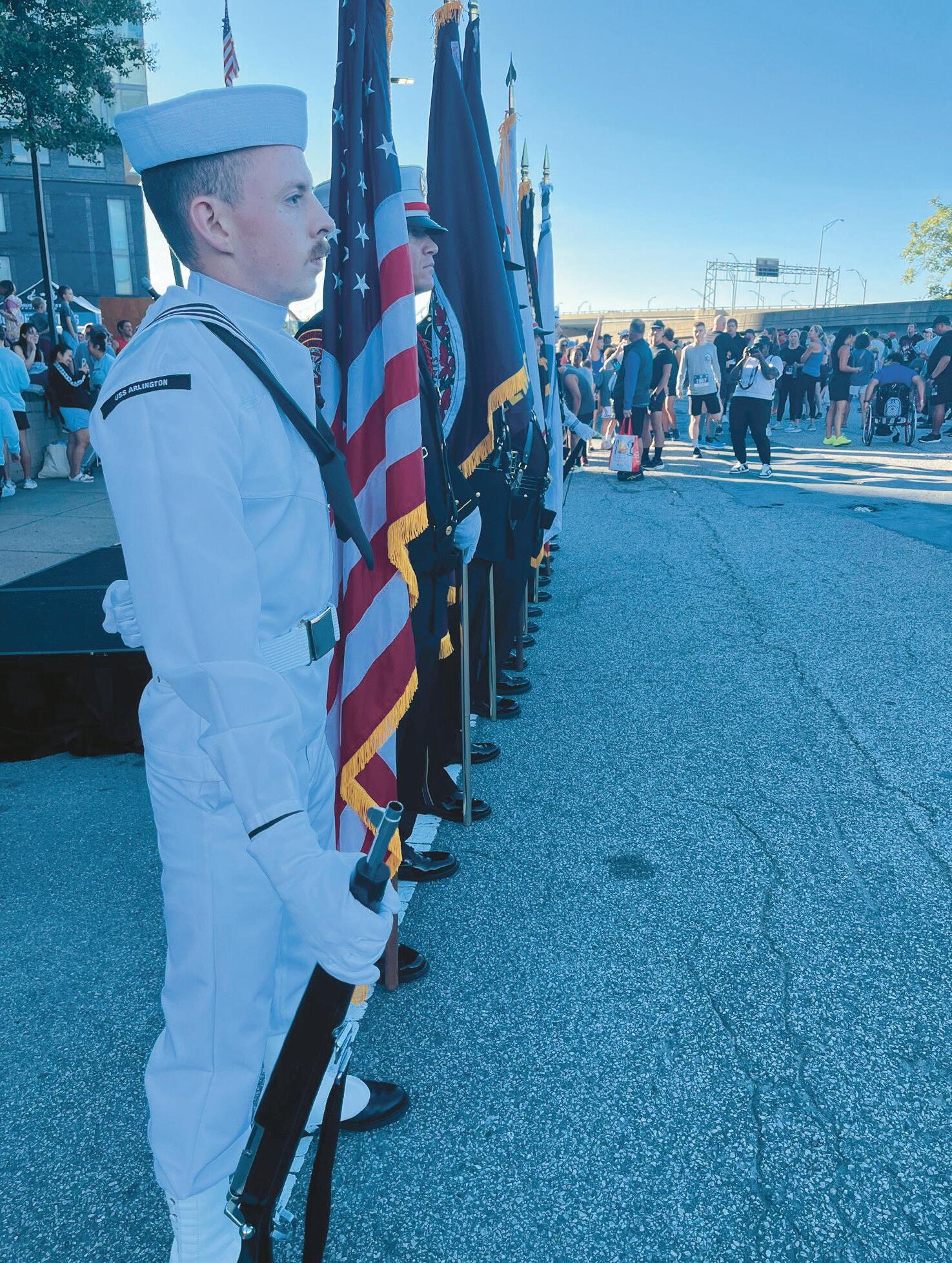 IanThompsonvisitedeachdivisiontojudge andratetheirguide-onflags Afterthejudging was complete, the participants made theirwayacrossthefieldtothestartingline in front of the NAVSTA Norfolk HeadquartersBuilding