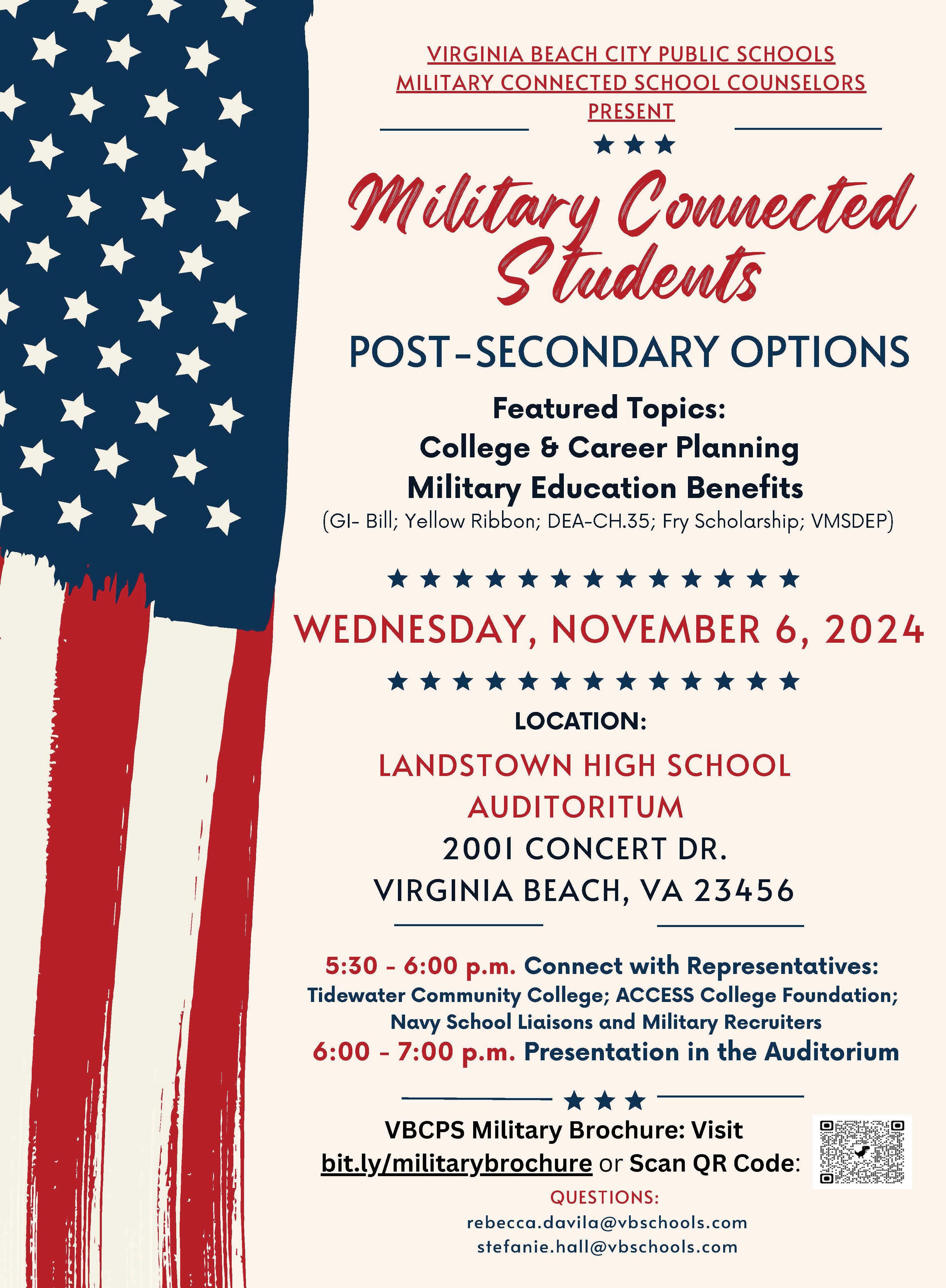 “Being military-connected does offer a lot of post-secondary options,” she said. There are numerous scholarships and financial aid offered to these students, and she works to help families find and apply for these opportunities. Nutter and other area school liaison officers will be available to meet families with children in the Virginia Beach City Public School System Nov. 6 at 5:30 p.m. during an information session at Landstown High school.