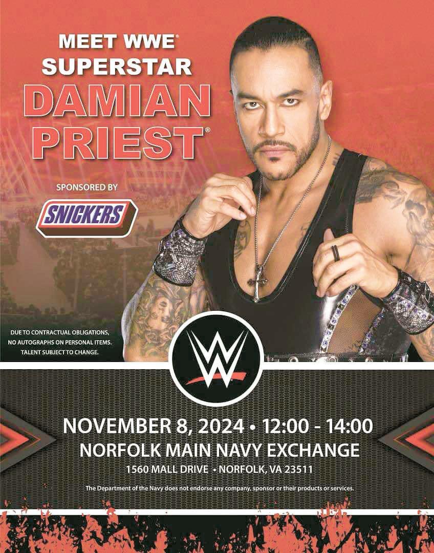 WWE wrestling fans in the HamptonRoads Area, if youwant to meet WWE Superstar Damian Priest, then THE place to be on November8th is at the Norfolk Main Navy Exchange at 1560 Mall Drive Norfolk,Virginia.