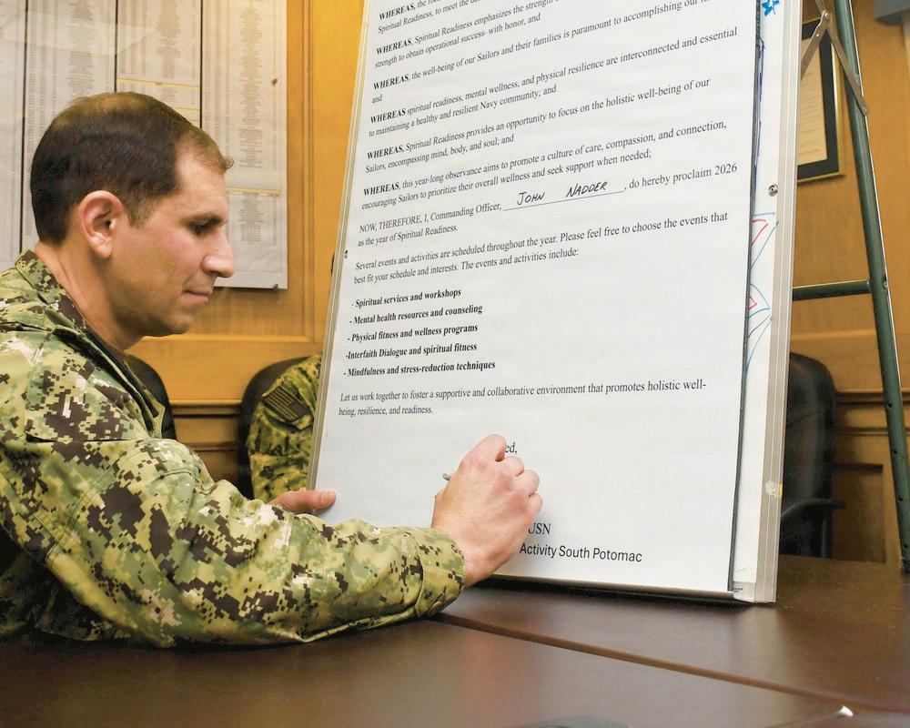 Capt.John Nadder, commanding officerofNaval SupportActivitySouth Potomac(NSASP),signs the Spiritual Readiness proclamation at NavalSupportFacility(NSF) Dahlgren on Feb. 27 (PHOTO BYANDREWREVELOS)