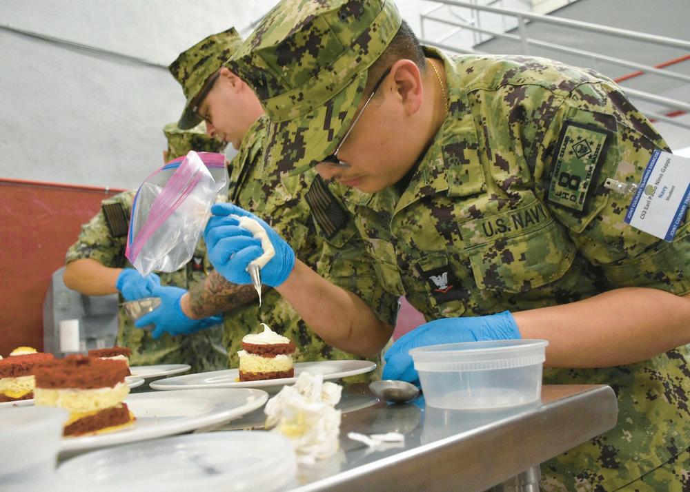 Navy Culinary Arts Team member Culinary Specialist Third Class Earl Gappi (above left) puts the finishing touch on dessert and Navy Culinary Arts Team member Culinary Specialist